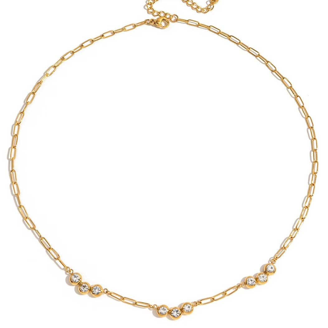 Dainty CZ Necklace Delicate and refined, this water-resistant chain features evenly spaced crystals along a fine gold link. The subtle sparkle makes it the perfect piece to wear solo or layered with your favorites. Lightweight yet luxe, it adds effortless glow to any look.