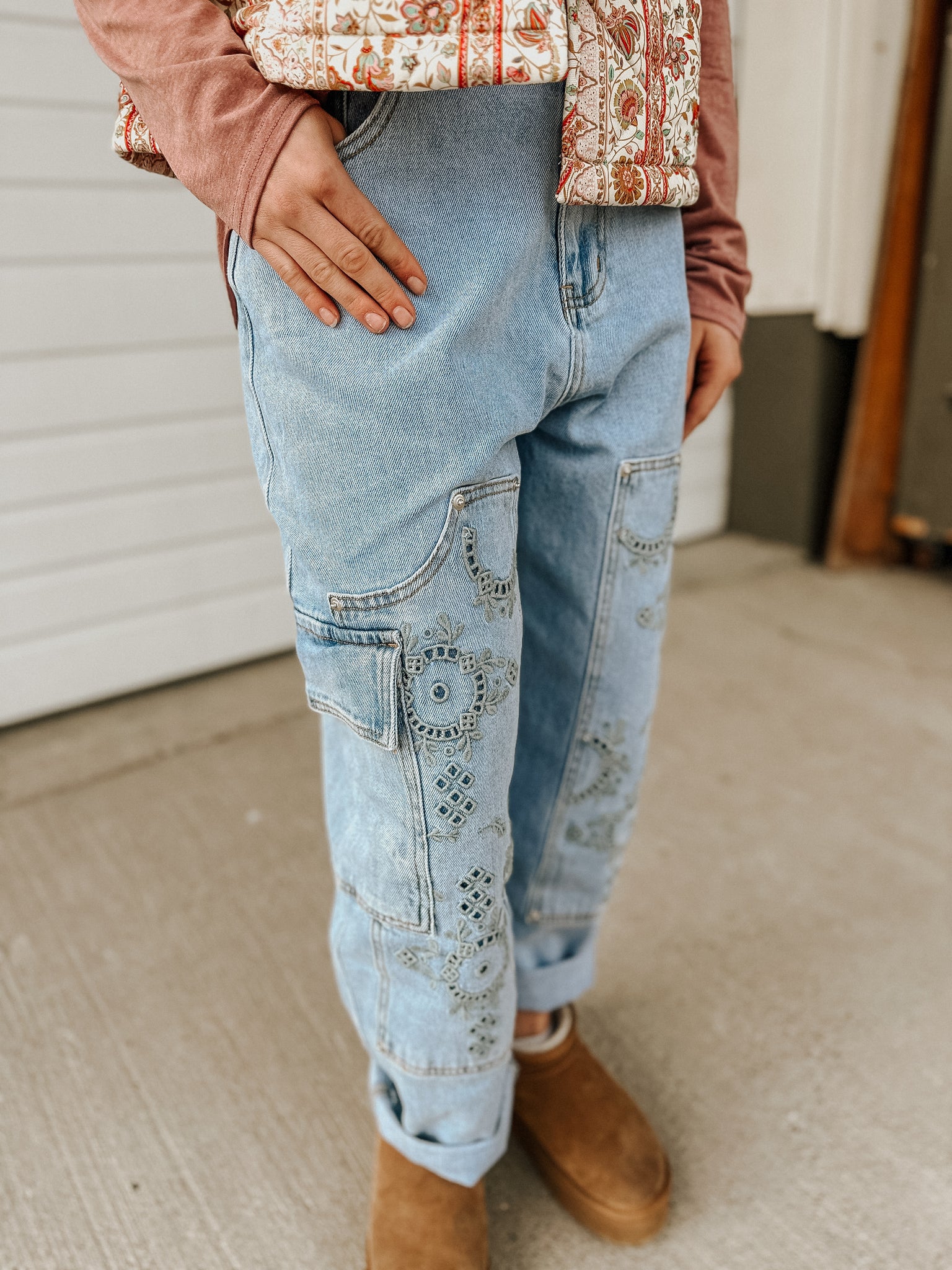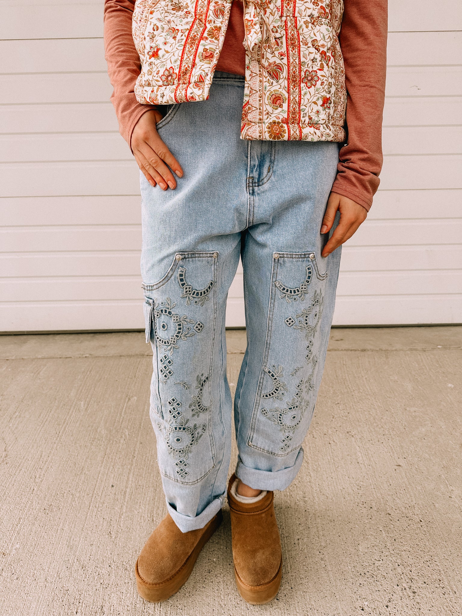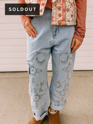 High rise barrel leg denim jeans with utility cargo pocket, western-inspired embroidery, and relaxed fit for a modern casual look 93% Cotton, 6% Polyester, 1% Spandex Model is 5'8" tall and wearing size Small