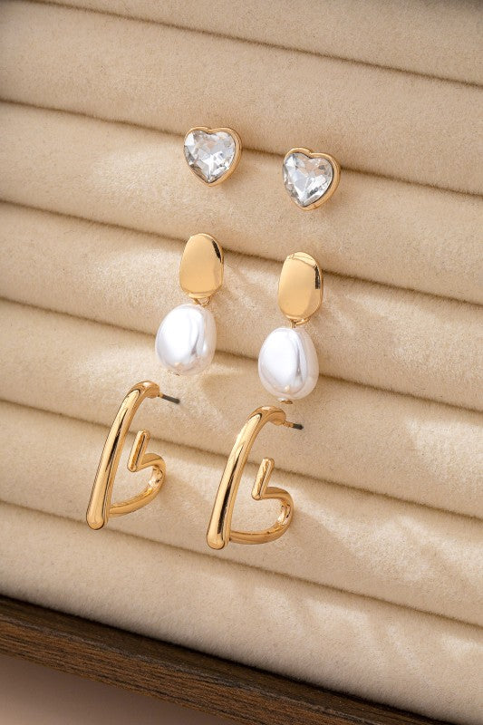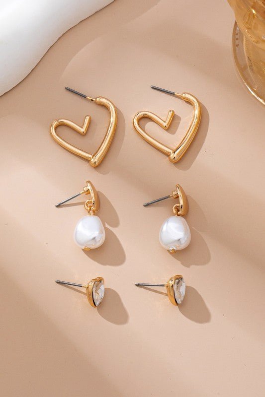 Heart Drop Pearl Studded Hoop Trio Earrings, this set includes three chic designs: elegant pearl-studded hoops, delicate heart drop accents, and versatile styles perfect for layering or standalone wear.