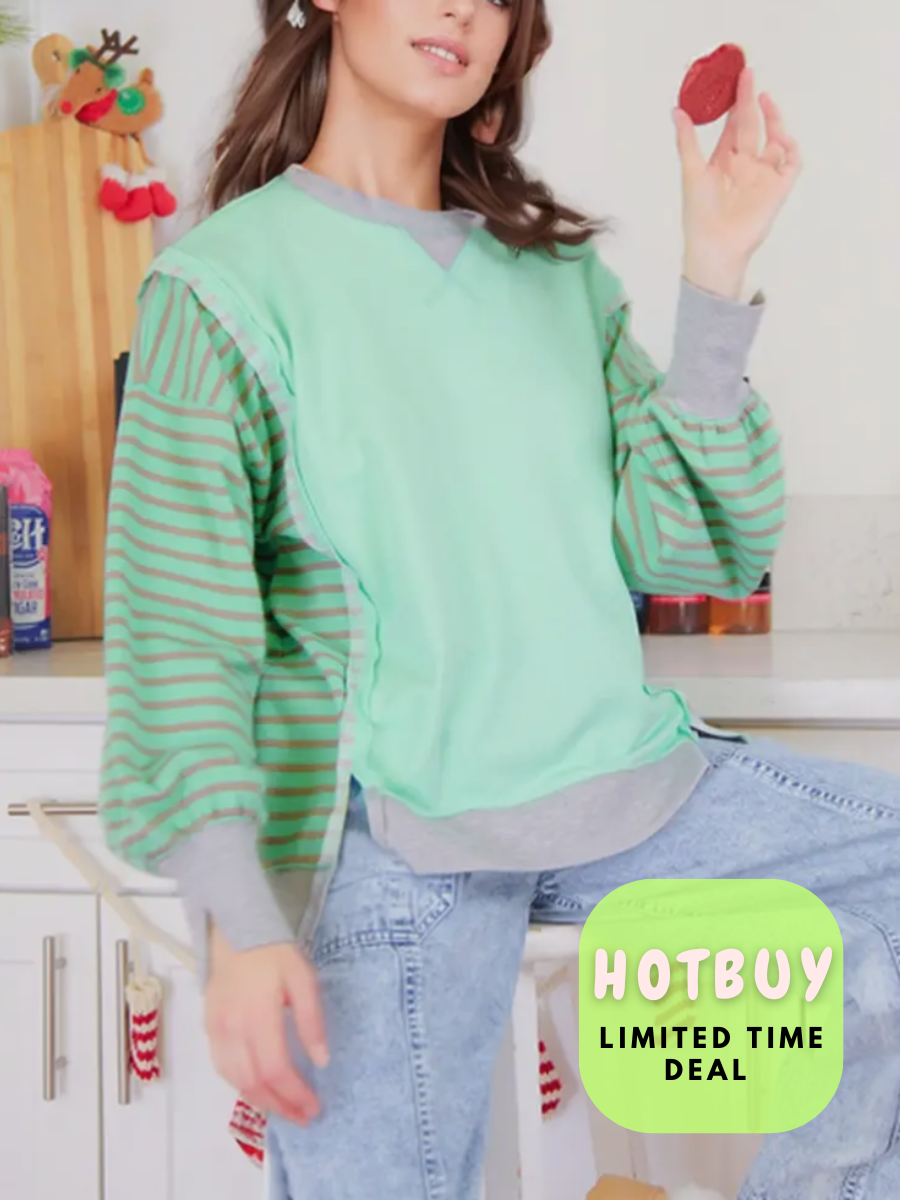 - Oversized Floral & Stripe Casual Knit Top - Split Neck - Long Sleeve - Raw Edge Detail - Round Hem (Model height: 5"8", wearing a Small, 2-2-2 Size Ratio, NEW IN) CONTRAST: 50%COTTON 50%POLYESTER