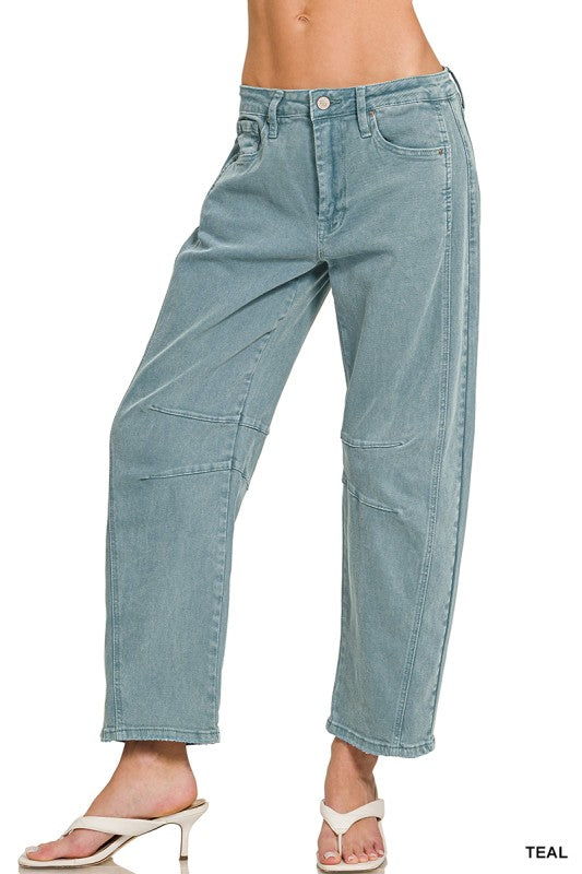 BARREL-LEG COLOR DENIM PANTS FRONT RISE: 10", INSEAM: 27" approx. LEG OPENING: 16.5" approx. -MEASURED FROM SIZE SMALL