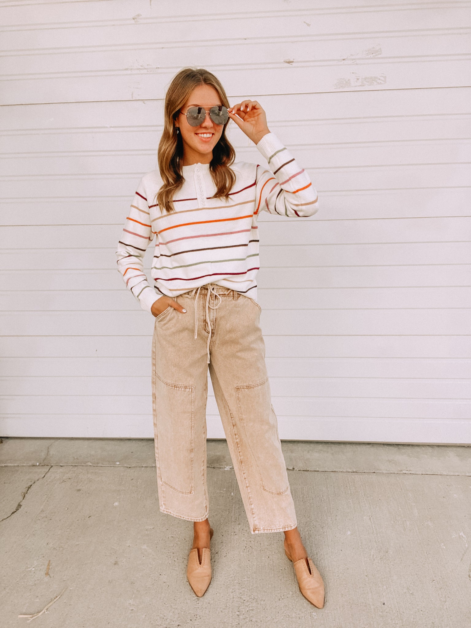 Brushed soft fabric with multi color stripes and a series of small petite buttons at neckline that are functioning
